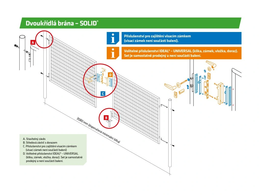 Dvoukřídlá zahradní brána SOLID je vyrobená z poplastovaného materiálu a slouží pro spolehlivý průjezd plotů rodinných domů, chalup, chat, soukromých pozemků, zahrad, parků a škol. Vyznačuje se vysokou kvalitou, vysokou odolností výplně, bezpečností, dlouhou životností a jednoduchou montáží. Obsahuje uzavřený rám z kulatých profilů, jehož výplň tvoří svařované pletivo. Součástí brány jsou 2 sloupky včetně stavitelných kloubových závěsů a také kovová oka pro visací zámek. V případě zájmu lze zamykání do kovových ok visacím zámkem zaměnit za plnohodnotný set IDEAL UNIVERSAL. Tato brána se výborně hodí k plotům ze svařovaného pletiva, ale může být použita i pro jakékoliv jiné druhy oplocení.