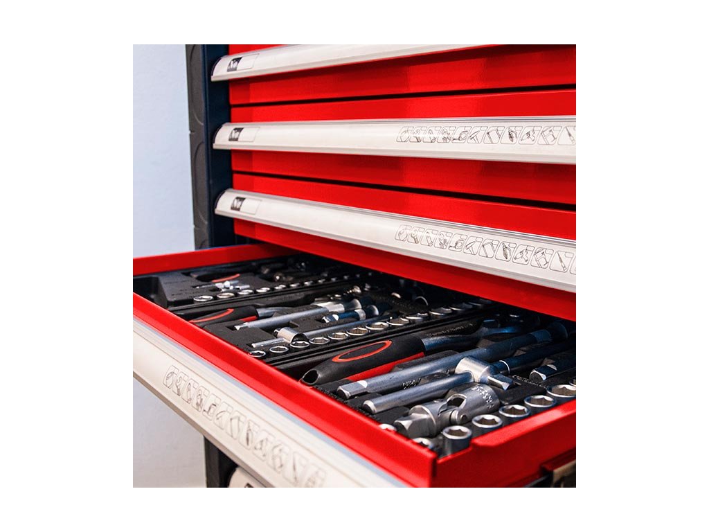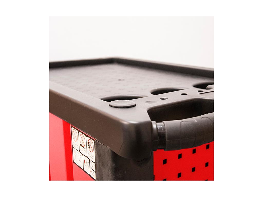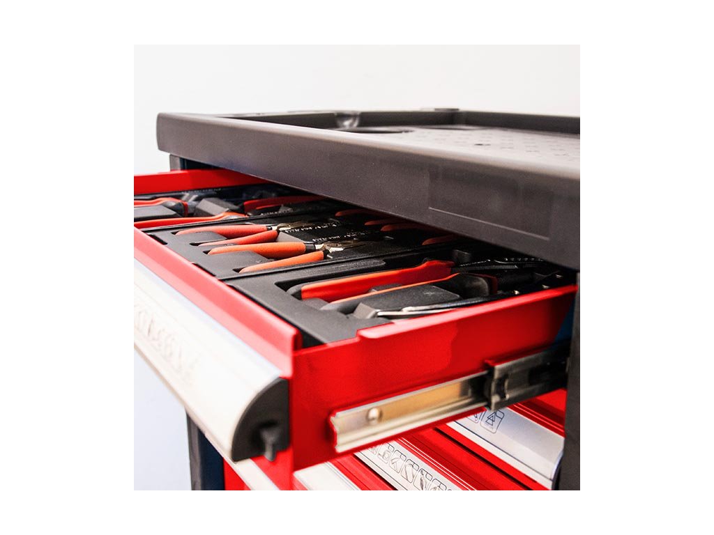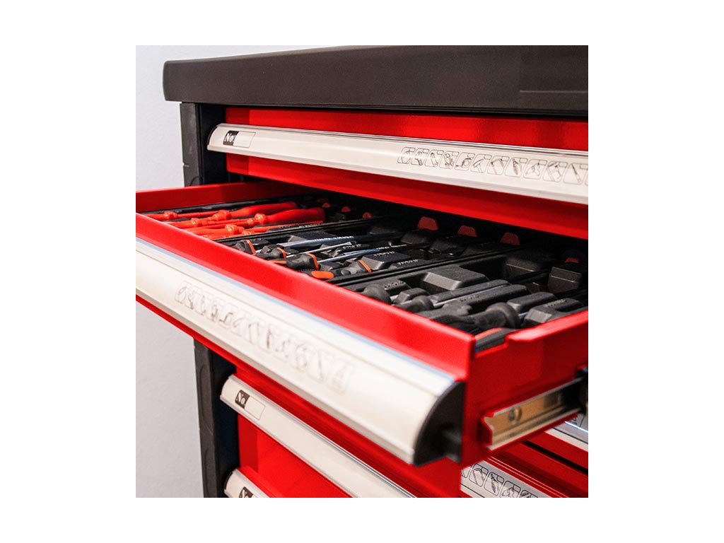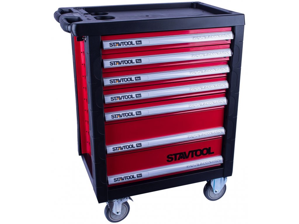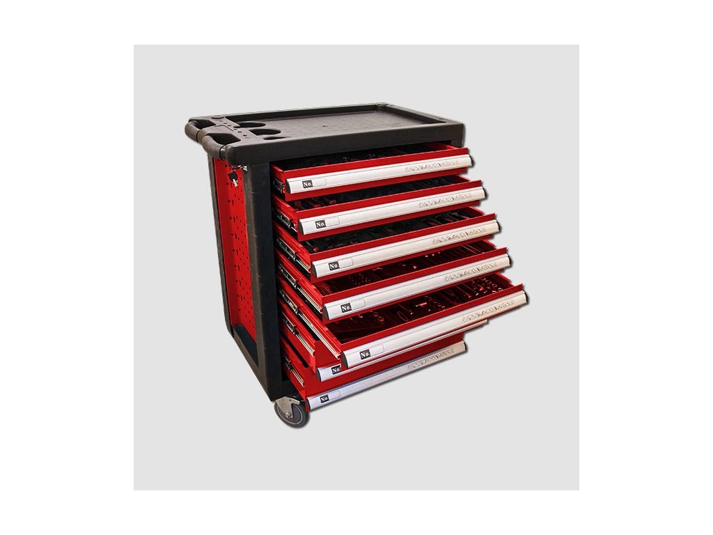 Kovový montážní vozík na nářadí se 7 zásuvkami. Dvě pevná a dvě otočná kolečka s poziční brzdou. Zásuvky na kuličkových ložiskách lze vysunout 40 cm. Horní pracovní plocha i zásuvky jsou vypodloženy protiskluzovou podložkou. Držadlo pro manipulaci s vozíkem lze umístit z pravé nebo levé strany. Uzamykatelné zásuvky. 5 nízkých a 2 vysoké zásuvky. Montážní vozík obsahuje 234 kusů nářadí.