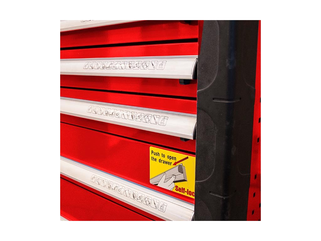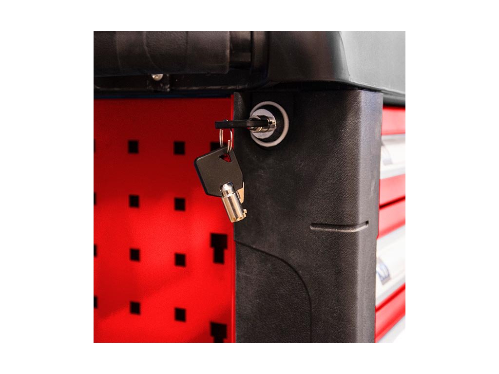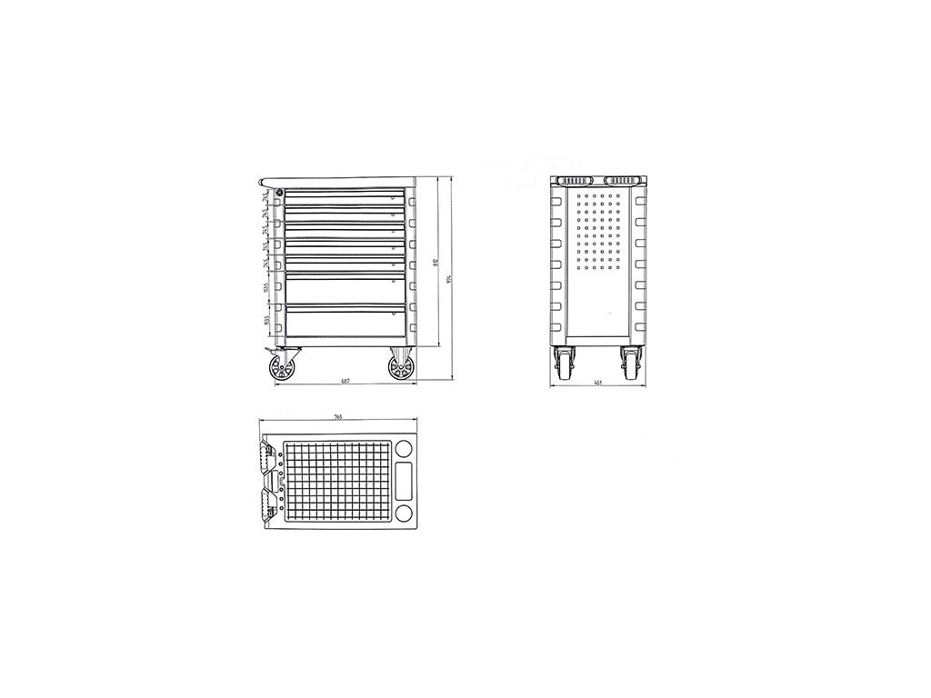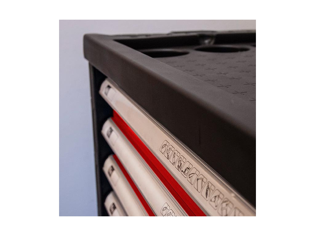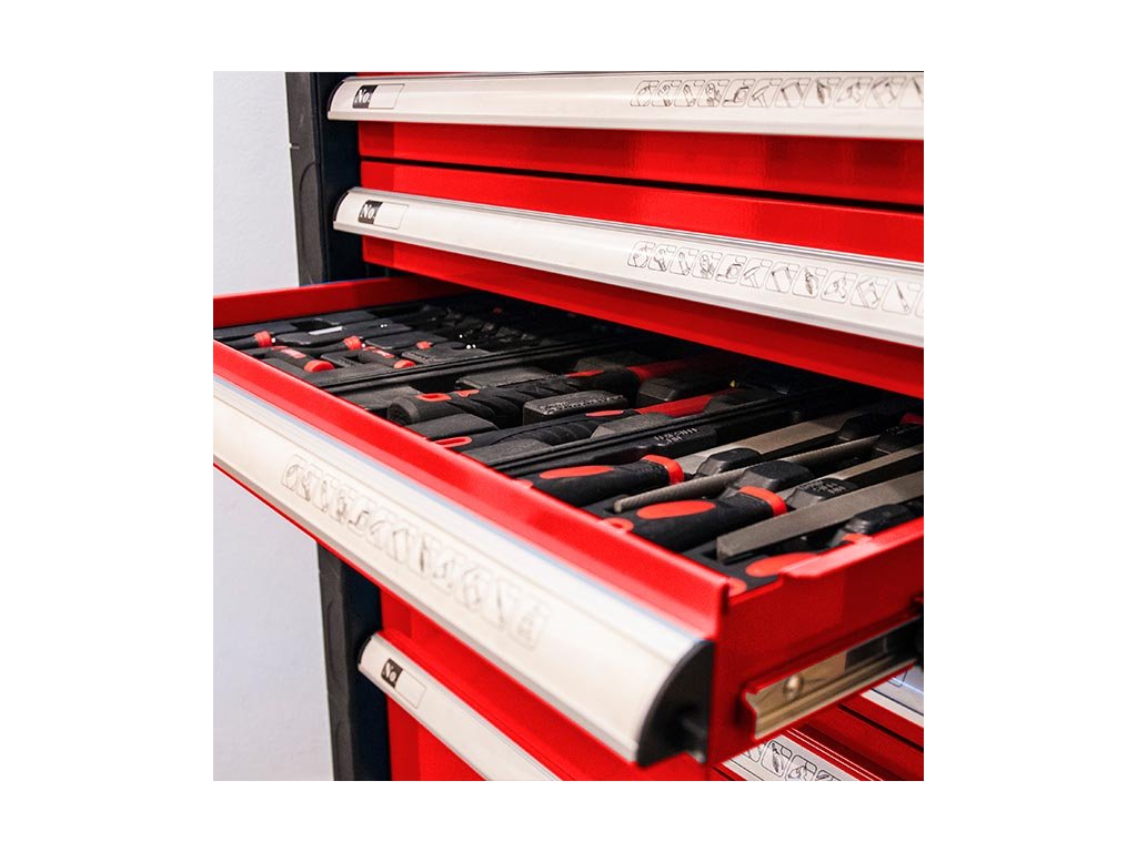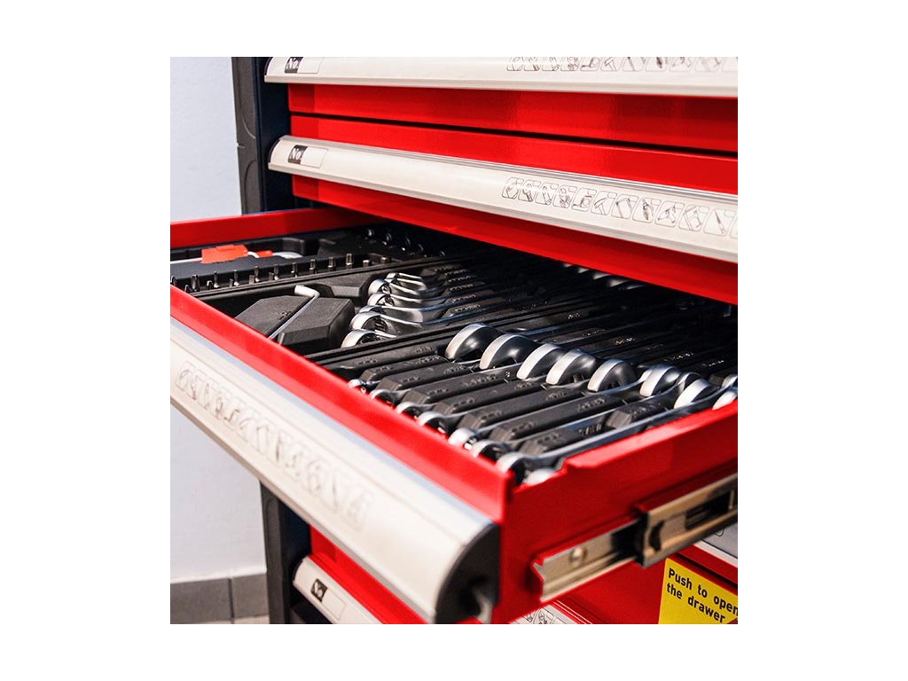 Kovový montážní vozík na nářadí se 7 zásuvkami. Dvě pevná a dvě otočná kolečka s poziční brzdou. Zásuvky na kuličkových ložiskách lze vysunout 40 cm. Horní pracovní plocha i zásuvky jsou vypodloženy protiskluzovou podložkou. Držadlo pro manipulaci s vozíkem lze umístit z pravé nebo levé strany. Uzamykatelné zásuvky. 5 nízkých a 2 vysoké zásuvky. Montážní vozík obsahuje 234 kusů nářadí.