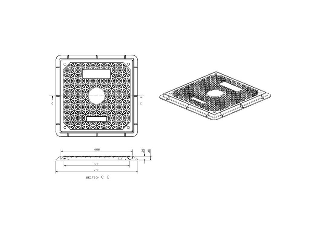 Tento poklop je vyrobený z velmi odolného kompozitu a slouží jako doplňkový prvek pro uzavření kanalizační revizní šachty s vnějším průměrem 600 mm. Běžně se také používá jako samostatný doplňkový prvek, který poskytuje spolehlivé uzavření jakýchkoliv již dříve instalovaných betonových, zděných nebo plastových šachet a prohlubní v zemi. Poskytuje vysokou mechanickou, chemickou a tepelnou odolnost, odolnost proti povětrnostním vlivům a UV záření, protiskluzový povrch, snadnou údržbu a instalaci a také dlouhou životnost. Obsahuje kompozitní rám, který zvyšuje odolnosti proti deformaci a také šrouby pro spolehlivé upevnění. Tento typ poklopu lze využít v prostorách rodinných domů, chalup, chat, budov, dvorků, teras, zahrad, pěších zón, cyklostezek, chodníků, parků, zatravněných ploch, vjezdů do garáží a parkovišť pro osobní automobily.