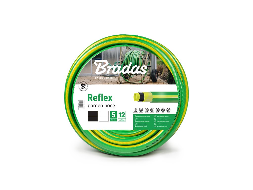 Zelená zahradní hadice REFLEX je vybavena 5 vrstvami z měkčeného PVC se zvýšenou odolností proti tlaku a navíc vyztužena speciálním polyesterovým opletem TRICOT, který minimalizuje kroucení hadice. Odolává UV záření a usazujícím se řasám. Lze ji využít pro zavlažování zahrad a zemědělských půd.